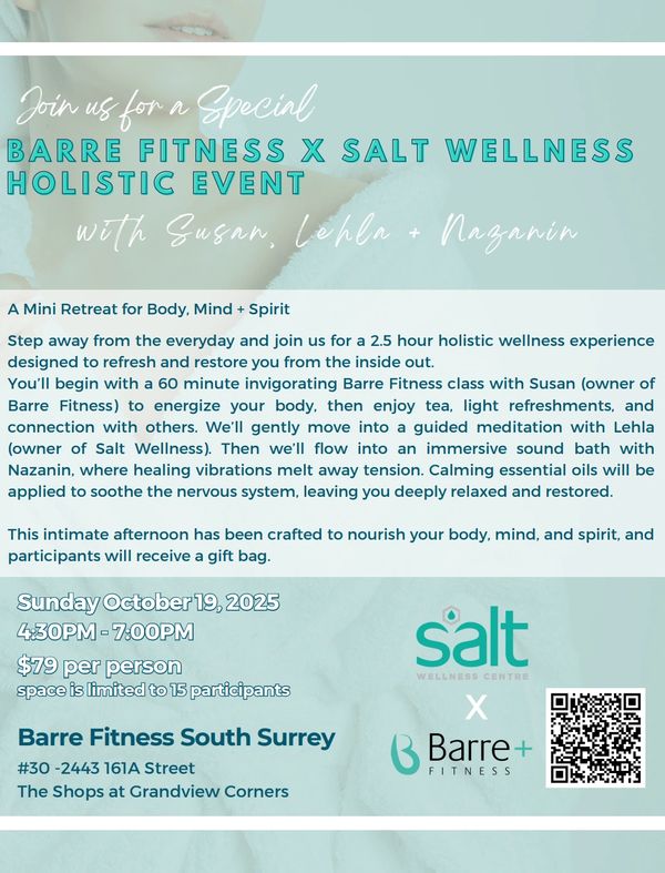 A Mini Retreat for Body, Mind & Spirit Step away from the everyday and join us for a 2.5 hour holistic wellness experience designed to refresh and restore you from the inside out. You’ll begin with a 60 minute invigorating Barre Fitness class to energize your body, then enjoy tea, light refreshments, and connection with others. We’ll gently transition into a guided meditation, and flow into an immersive sound bath to calm the nervous system and leave you deeply relaxed and restored. This intimate afternoon is crafted to nourish your body, mind, and spirit. How to join: 1. Purchase your class credit. 2. Be sure to reserve your spot in the 4:30pm session on Sunday, October 19, 2025. Space is limited to just 15 participants, so reserve your spot today.